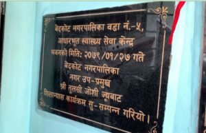 महेन्द्रनगर । कञ्चनपुरको वेदकोट नगरपालिकाको एक आधारभुत स्वास्थ्य केन्द्रको नवनिर्मित भवनको उदघाटन गरिएको छ । सोमवार वेदकोट गरपालिका ५ धरमपुरमा रहेको आधारभुत स्वास्थ्य केन्द्रको कार्यक्रमका प्रमुख अतिथी एवम वेदकोट नगरपालिकाका नगर उपप्रमुख तुलसी जोशीले उदघाटन गर्नु भएको हो ।