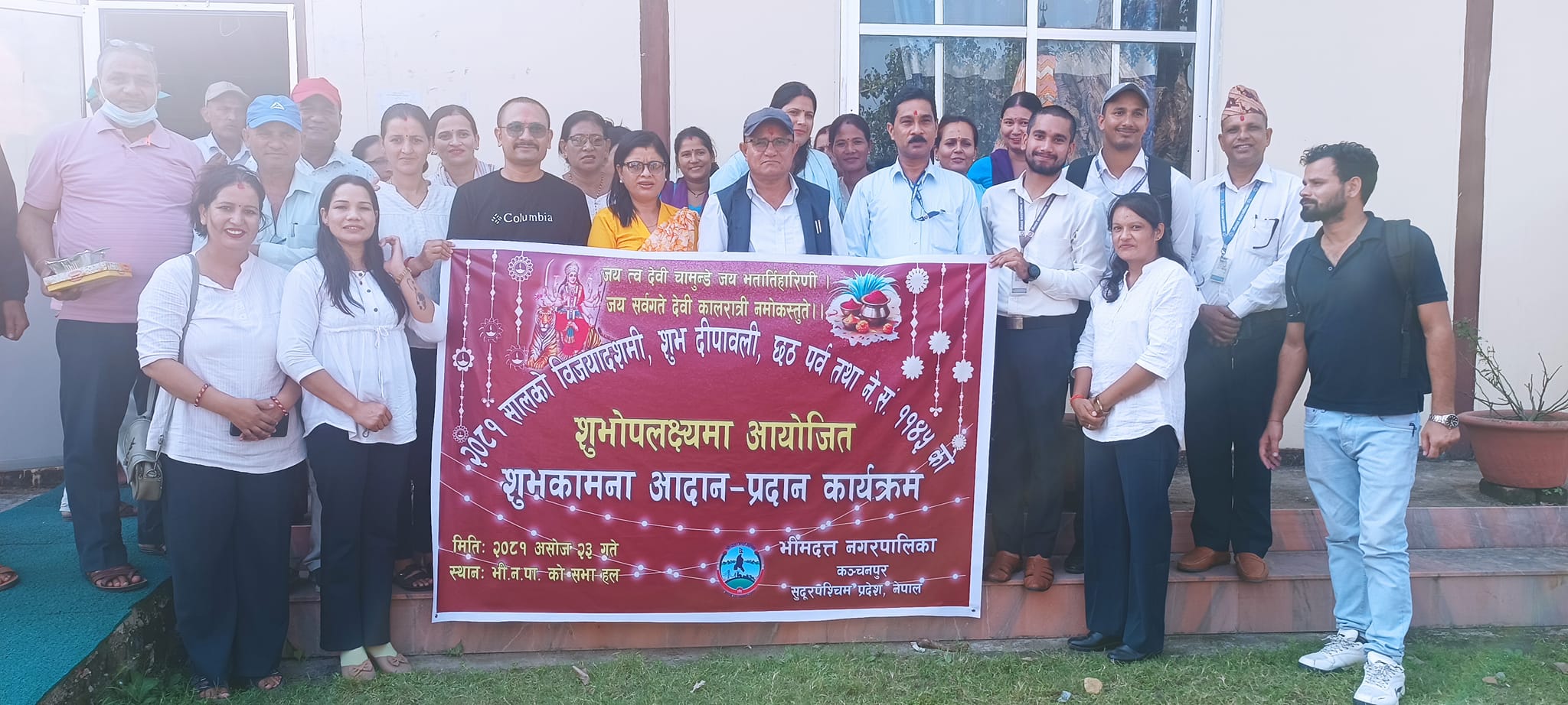 महेन्द्रनगर । भीमदत्त नागरपालिकाले नेपालीहरुको महान पर्व बिजया दशमी तथा शुभ दिपावली र छठ पर्बको अवसरमा शुभकामना आदानप्रदान कार्यक्रम सम्पन्न गरेको छ । बुधवार कार्यबाहक नगर प्रमुख निलम लेखकको सभाध्यक्षमा सम्पन्न भएको उक्त कार्यक्रममा पालिकाका प्रमुख प्रशासकिय अधिकृत, वडा अध्यक्षहरु, कर्मचारीहरु नगर प्रहरी लगायतको उपश्थिती रहेको थियो ।