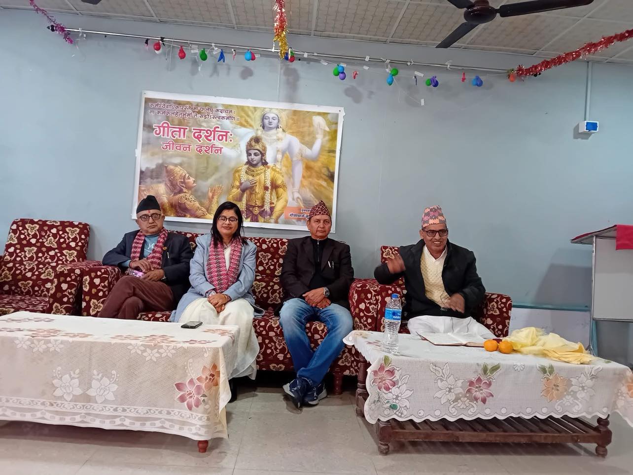 उक्त प्रवचनमा उपयुक्त खानपिन,सकारात्मक व्यबहारलाई आफनो जिवनमा लागु गर्नु पर्ने लगायतका विषयमा जानकारी प्रदान गरिएको थियो । साथै, आफनो व्यवहारिक जिवनमा कर्म गर्ने अधिकार भएपनि उक्त कर्म अनुसारको फल स्वत्तः पाईने कुरा गिताको दर्शनमा उल्लेख रहेको प्रवचनकर्ता सुरेन्द्र ओझाले बताउनु भयो ।
