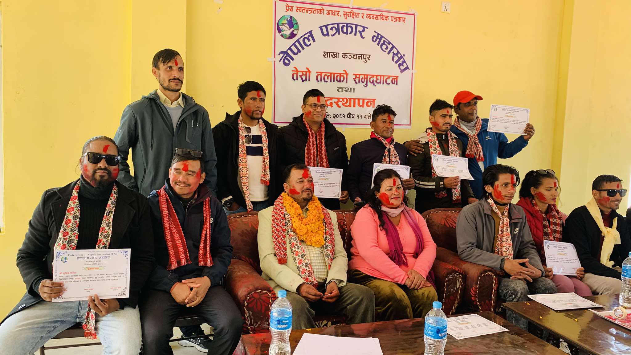 महेन्द्रनगर । नेपाल पत्रकार महासंघ कञ्चनपुरका नवनिर्वाचित पदाधिकारीहरुले पदभार ग्रहण गरेका छन् । ११ औं अधिवेशनबाट निर्वाचित समितिको बिहीबार पदस्थापन गरिएको हो । आर्थिक मामिला तथा योजना मन्त्री बहादुर सिह थापाको प्रमुख आतिथ्यमा कार्यक्रम गरी नव निर्वाचित समितिको पदस्थापन गरिएको छ ।