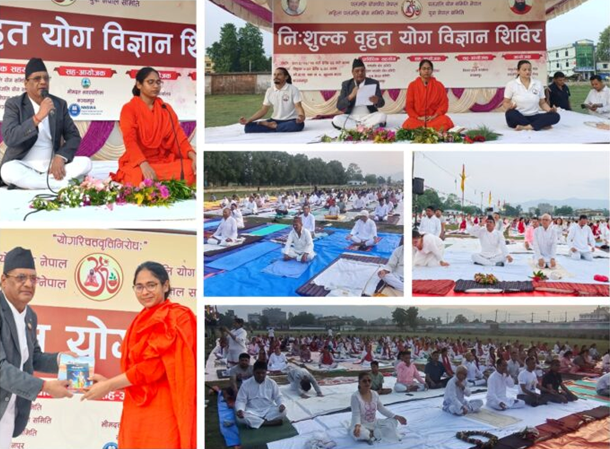 महेन्द्रनगर । भीनपा ४ स्थित खुल्ला मञ्चमा सप्त दिवसीय निःशुल्क वृहत योग विज्ञान शिविर सञ्चालन भएको छ । आज शनिवारबाट शुरु भएको योग शिविरमा योग ऋषि स्वामी रामदेव र आयुर्वेद शिरोमणि आचार्य बालकृष्णका परम शिष्या साध्वी डा. देवविजयाका मुख्य प्रशिक्षक तथा मार्गदर्शनमा सुदूरपश्चिम प्रदेश सरकारका आर्थिक मामिला मन्त्री बहादुर सिह थापाको प्रमुख आतिथ्यता रहेको थियो ।‘