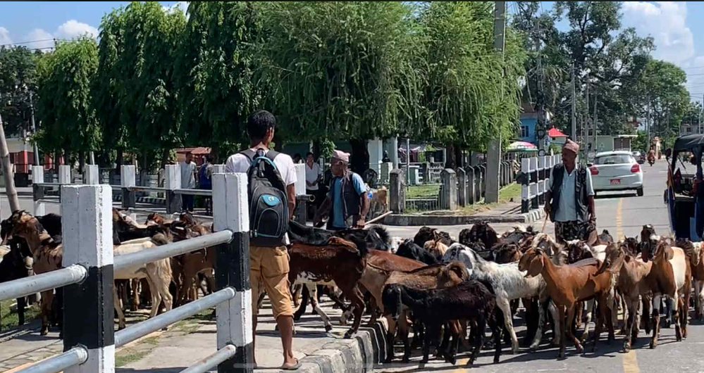 महेन्द्रनगर । दशैं नजिकिँदै गर्दा कञ्चनपुरमा डडेल्धुरादेखी खसी बोका लिएर व्यापारीहरु तराई झरेका छन्। उनिहरुले तिन दिन पैदल हिँडेर आफनो खसी बोकाहरु महेन्द्रनगर बजारमा ल्याएका छन् । दसैँ–तिहारलगायत वर्ष भरीको खर्च जुटाउन डडेल्धुराको भित्री मधेसका किसान प्रत्येक वर्ष खसी बोका बेच्न तराई झर्ने गर्दछन् ।