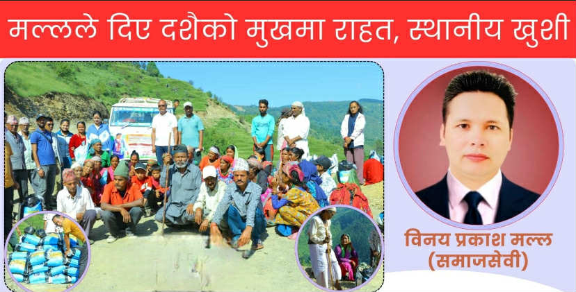 अहिले फेरी विजयादशमी तथा शुभ दिपावलीको अवसरमा डडेल्धुराको अमरगढी नगरपालिका वडा नंम्बर ९ का विपन्न, गरिव तथा सहारा विहिन लाई युवा समाजसेवी विनय प्रकाश मल्लले खाद्यान्न सहयोग गरेका छन् । अमरगढी नगरपालिका वडा नंम्बर ९को हतर्क, पनौली, ढकाउली, रोखला गाँउ , ढाँटगाँउ, लटसेरा, झुकालगाँउ, चमाल्लेख, साउनगाँउ का जम्मा ४३ परिवार लाई चामल, दाल, नुन, सावुन, तेल वितरण गरिएको हो ।