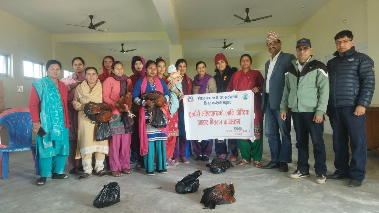 उनिहरुलाई यो बेलामा पौष्टिक आहार चाहिने भएकाले सावन १ गतेदेखी अहिले सम्म ८ जना सुत्केरी महिलाहरुलाई विभिन्न पौष्टिक आहारजन्य खानेकुराहरु वितरण गरेको छ । वडाले १ किलोग्राम घिउ, २ किलोको लोकल भाले कुखुरा, काजु बदाम, बच्चालाई नुहाउने साबुनलगायतका सामग्रीहरु वितरण गरेको वडा अध्यक्ष पदम बुढाले जानकारी दिनु भएको छ ।