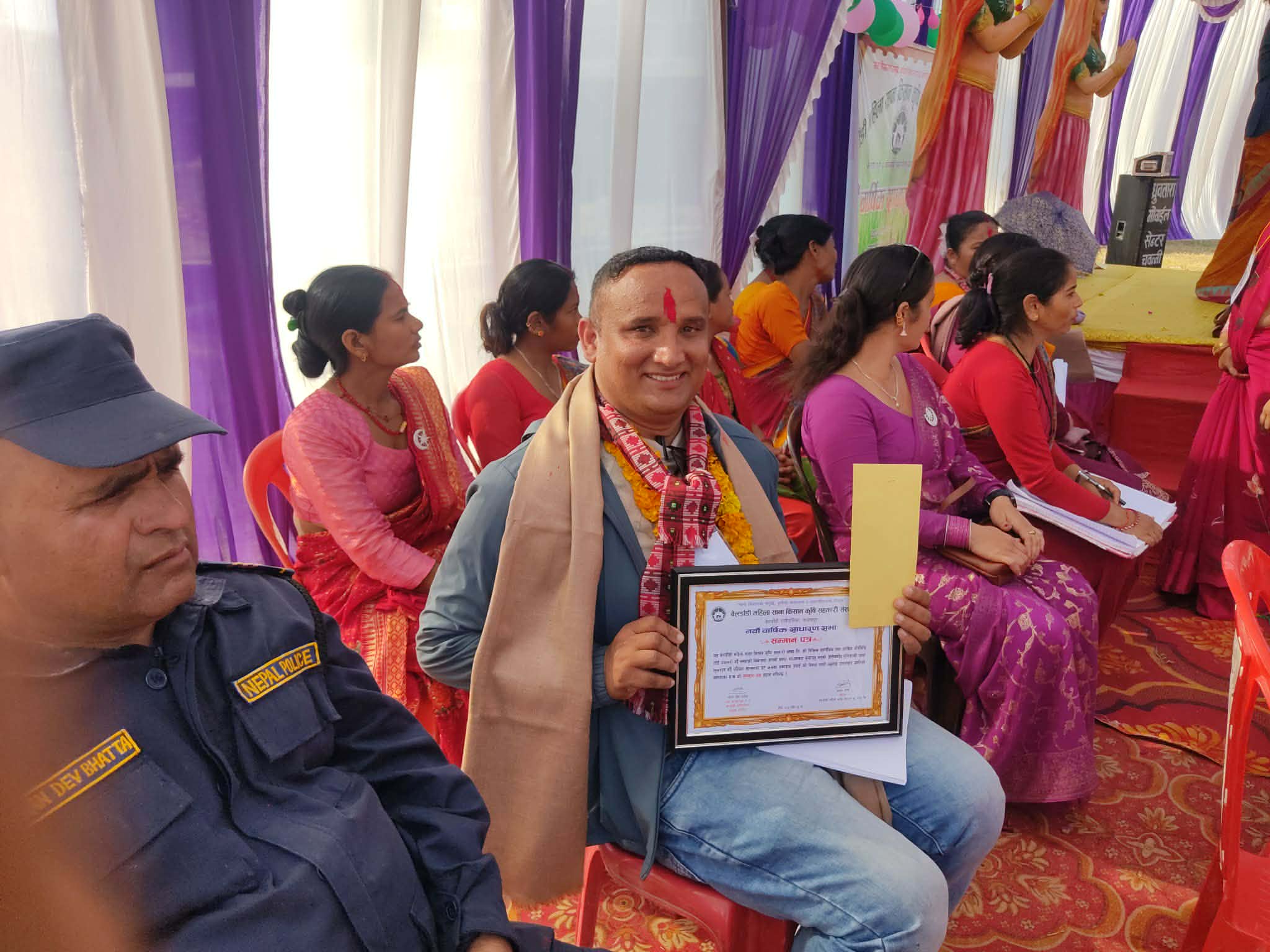 शनिबार सहकारीको ९ औँ वार्षिक साधारण सभाको अवसरमा आयोजित कार्यक्रममा पत्रकार धामीलाई दोसल्ला, माला, नगद र प्रशंसा पत्र प्रदान गर्दै सम्मान गरिएको छ ।