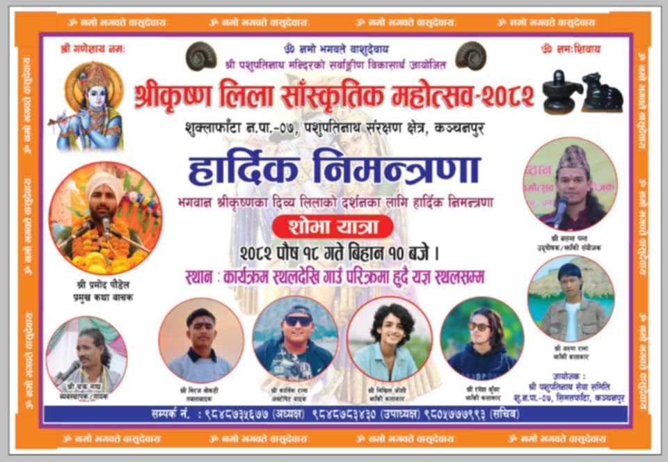 शुक्लाफाँटा क्षेत्रमा पहिलोपटक पशुपति सेवा समिति को आयोजनामा पौष १८ गते बाट शुक्लाफाँटा ७ सिमलफाटामा रहेको पशुपतिनाथ मन्दिरको प्राङ्गणमा कृष्णला सांस्कृतिक महोत्सव हुने भएको हो।