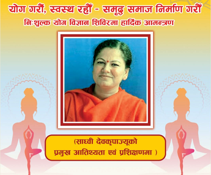 योग शिविरमा पतञ्जल योग समिति नेपालकी प्रखर विदुषी साध्वी श्रद्धेय देवकृपा ज्युको प्रत्यक्ष प्रशिक्षण रहने छ । शिविर मार्फत सम्पूर्ण सहभागीहरुले दैनिक जीवनशैलीमा सकारात्मक परिवर्तन ल्याउने अभ्यास सिक्ने छन् । अध्यक्ष जोशीका अनुसार योगलाई घरघरमा पु¥याउने, स्वस्थ जीवनशैली प्रवद्र्धन गर्ने, समाजमा योग र आयुर्वेदको महत्व बढाउने अभियानका साथमा यो शिविरको आयोजना गरीएको बताउनु भयो ।